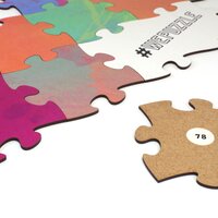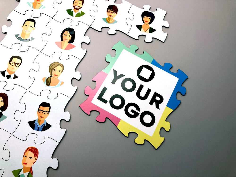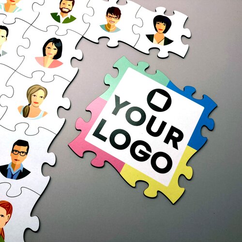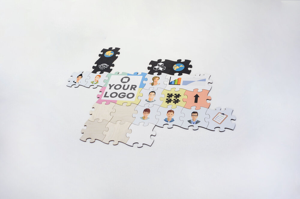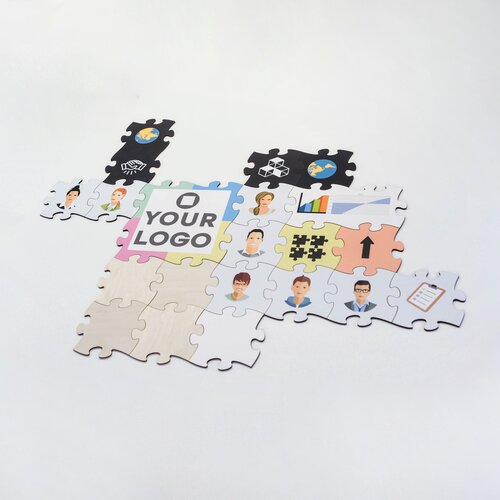 Sie können vorhandene Inhalte und Firmenlogos auf die Puzzleteile aufdrucken lassen und freie Flächen zur Gestaltung durch die Teilnehmer vorgeben.