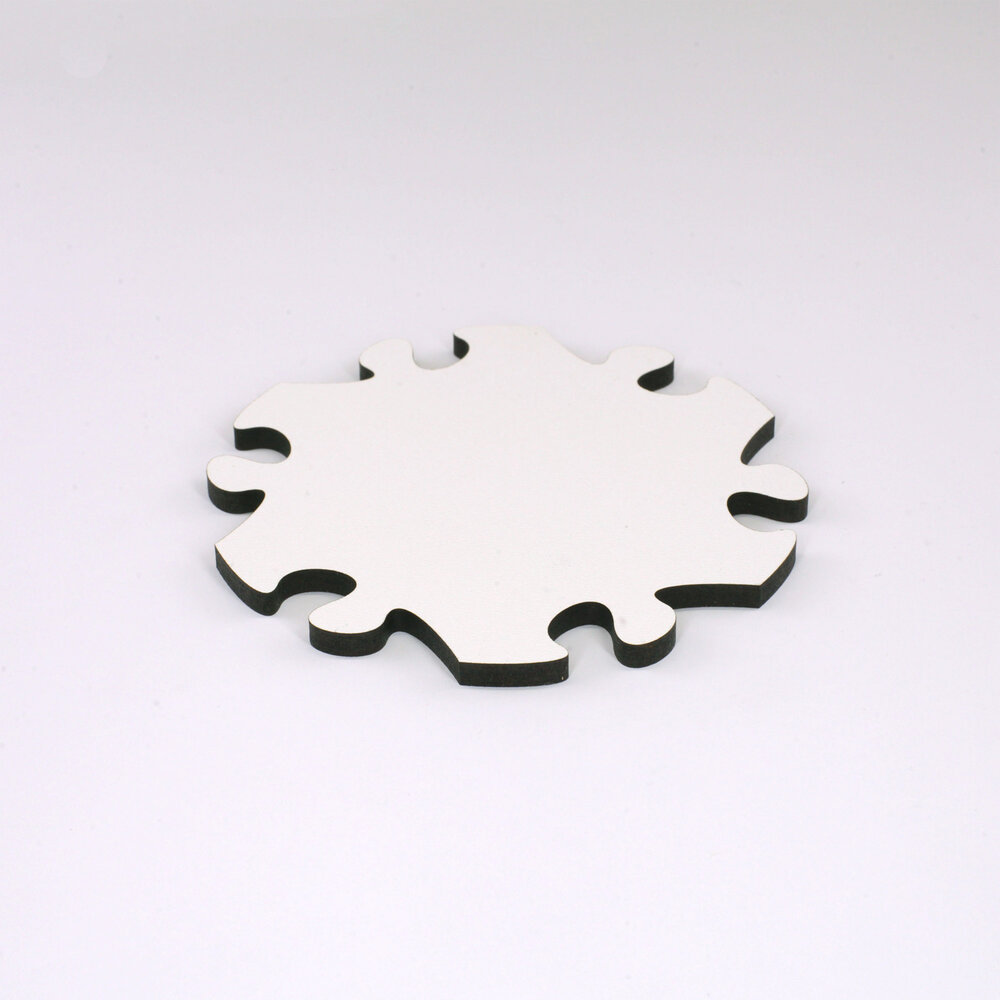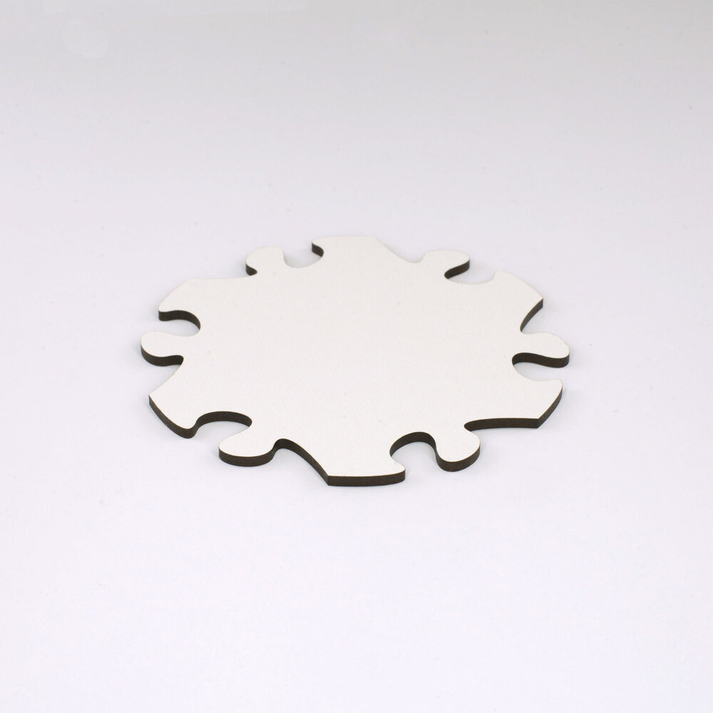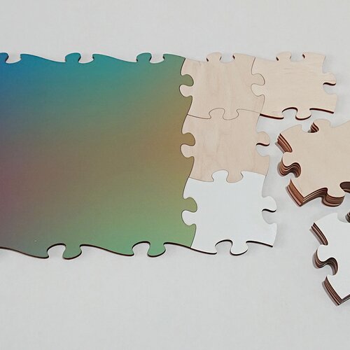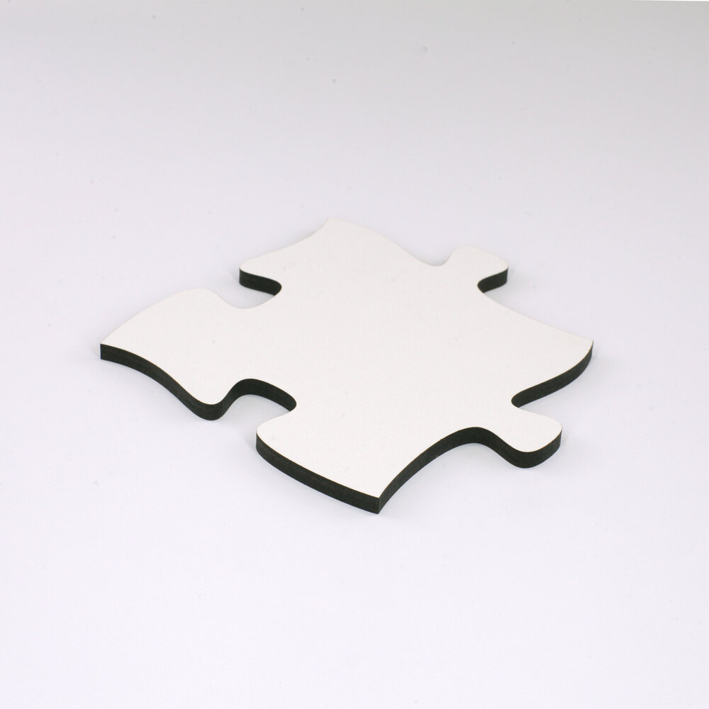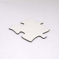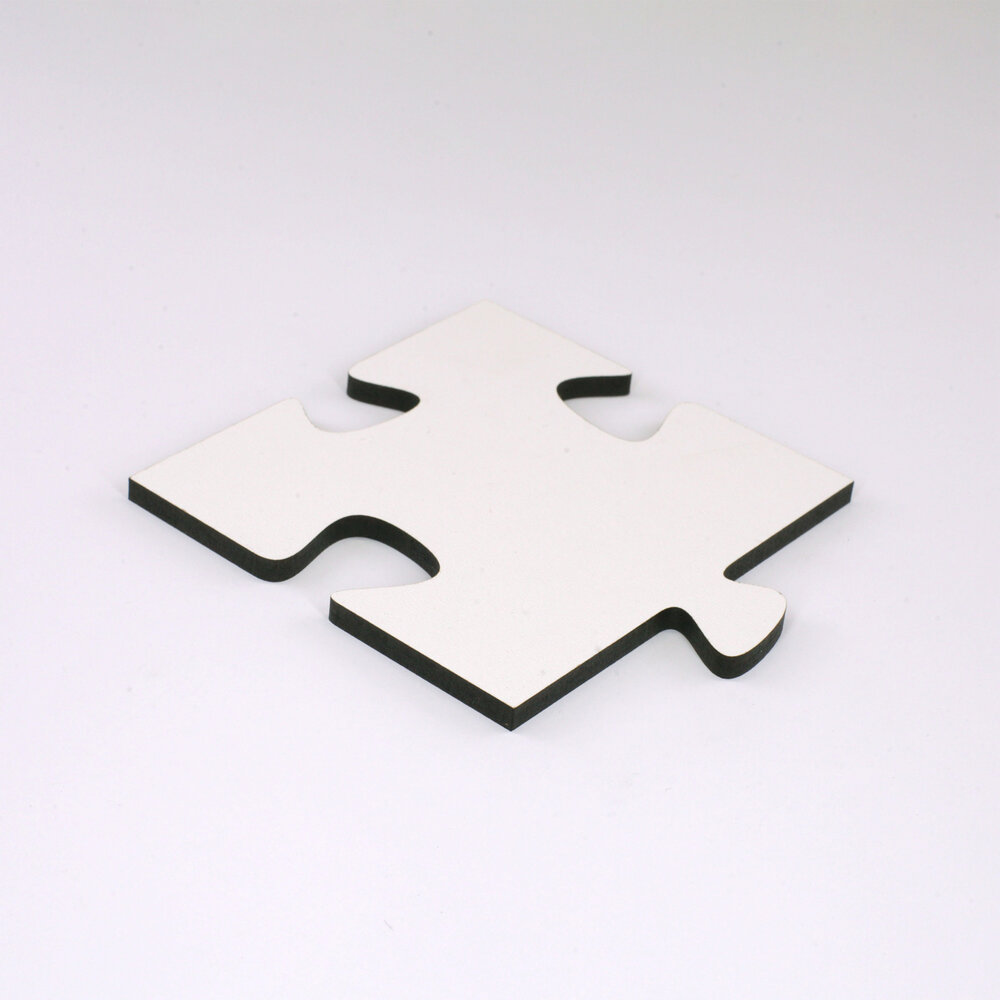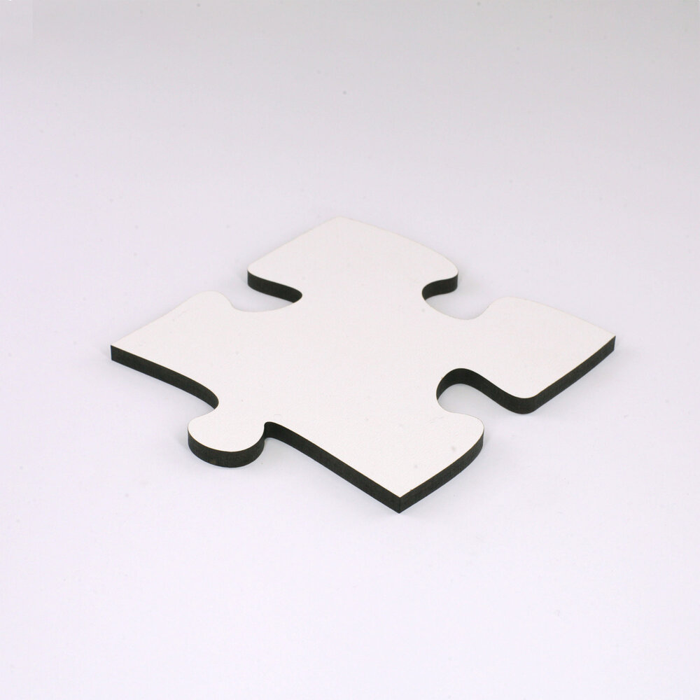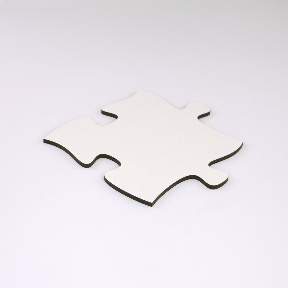 Blankopuzzles und Fotopuzzles sind aus hochdichter Faserplatte geschnitten. Dieses Material ist werkseitig auf einer Seite weiss beschichtet. Bei Blankopuzzles kommt diese nach vorn, bei Fotopuzzles auf die Rückseite.