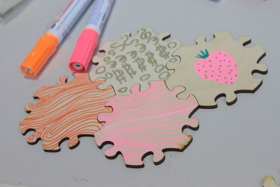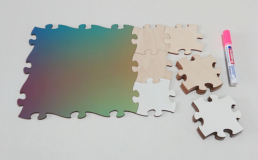 Unsere Blankopuzzleteile aus HDF oder Birkensperrholz können Sie selbst beschreiben, bekleben und bemalen. Dazu verwenden Sie am Besten Permanentmarker oder andere Filzstifte.