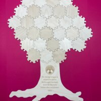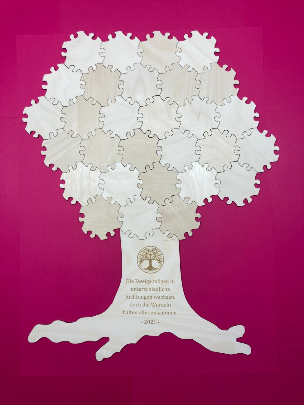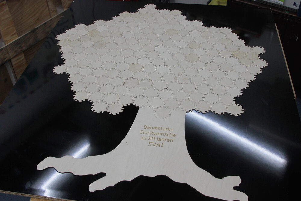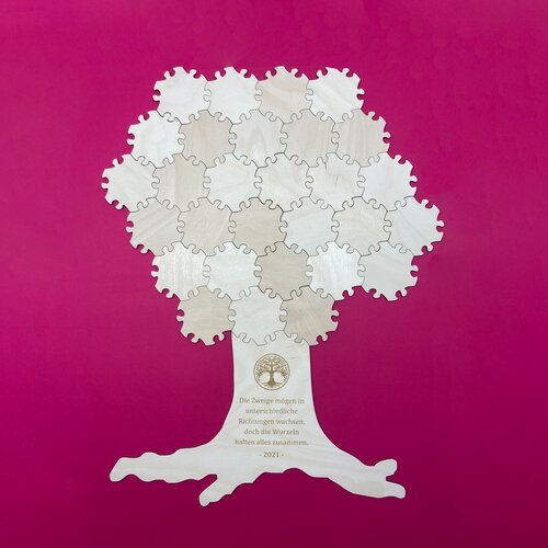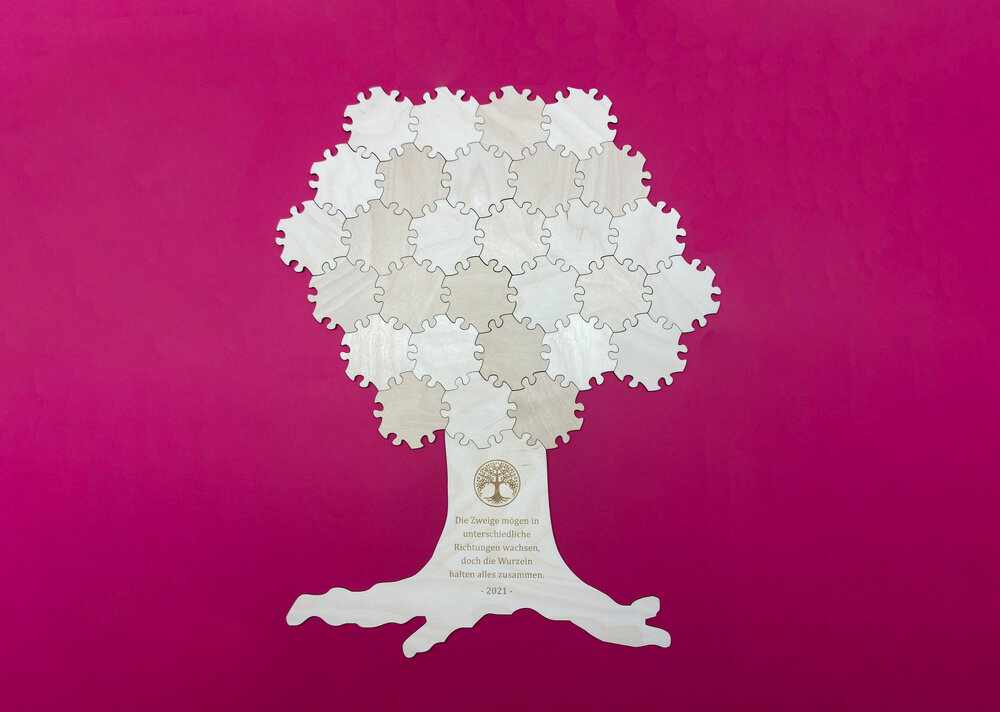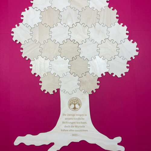 Für alle Teilgrößen der Hex-Puzzleteile gibt es Baumstämme als Anschlusselemente. Diese können aus Birkensperrholz mit natürlicher Holzoberfläche oder aus weisser Hartfaserplatte gefertigt werden. Auch bedruckte Baumstämme sind möglich. Sehr schön sind unsere Puzzlebäume auch mit einer Namensgravur. Ihre Wünsche zur Gravur können Sie uns auch noch nach der Bestellung über das Kontaktformular mitteilen.